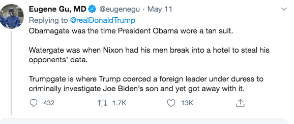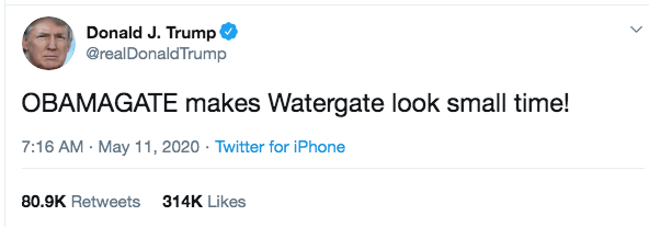 Well, here’s the new diversion tactic for the crappy job tRump has done with the coronavirus situation. What the hell is ‘Obamagate?’ It sounds like Captain Clorox doesn’t even know. When asked by reporters what he meant and what specific crimes he was alleging, his response was, “you know what the crime is,” and when pressed, he wasn’t able to name any. Unfortunately, his obsequious sycophants are jumping on the wagon and are doing what they can to raise the specter of wrongdoing by Joe Biden after Richard Grenfell, the acting director of intelligence, declassified and gave out the names on a list of Obama era officials who had asked to have the names unmasked of some folks listed in intelligence reports. One of those being investigated at the time was General Michael Flynn. Right or wrong, intelligence agencies routinely respond to “unmasking” requests and it is legal to do so. What is not usual, however, is to share the names of the individuals requesting the unmasking. In this case, Grenfell declassified a list and gave it to Senate Republicans. On Wednesday, Sen. Chuck Grassley (R-IA) and Sen. Ron Johnson (R-WI) released the list of Obama administration officials who submitted requests to unmask the identity of former National Security Advisor Michael Flynn. One of the names on the list was Joe Biden, and, done, I would suppose, to allege that Biden played a role in getting the FBI to investigate one of Trump’s allies. Here was one of the better replies to tRump’s tweet.