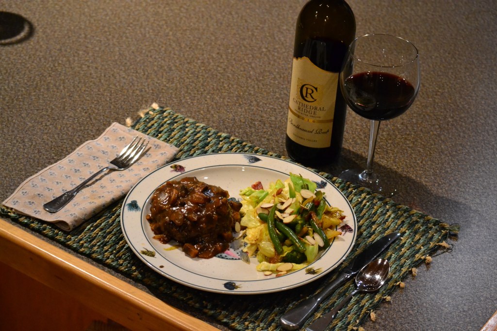 I’ll end this rambling with last night’s “fine dining” menu. Grass fed ground beef smothered with mushroom gravy, and a stir fry of broccoli, green beans, cabbage, onions, slivered almonds, and harissa ( a spicy and aromatic chile paste that’s a widely used staple in North African and Middle Eastern cooking). Accompanied by a 2016 Cathedral Ridge Bourdheauxd Red, pronounced “board-head” for the Hood River, Oregon wind surfers and kiteboarders. Delicioso!