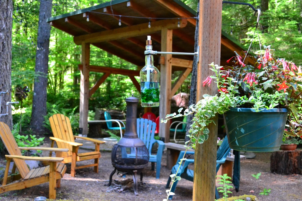 A few blogs back I talked about my repurposing projects with some old solar light parts. I finished two more projects today. The first was a chandelier for our outdoor timber frame structure. Our friend Connie gave me a round ring from, I think, a planter base about a year ago to use as the base for a light fixture. Any hoo, a couple of pieces of chain and some outdoor edison lights and voila — a chandelier.
