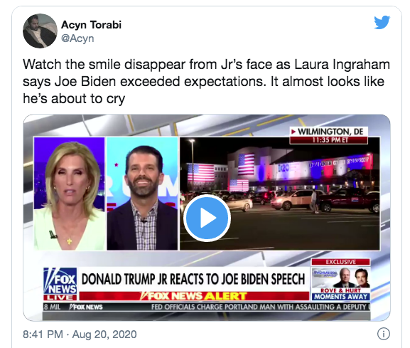 “The current president’s cloaked America in darkness for far too long,” and “make no mistake, united we can and will overcome this season of darkness.” Wow! Joe crushed it last night, giving, some say, the best speech he has ever given. Even Fox News and critics from the other side of the aisle gave praise for the speech. From Erick Erickson, a conservative commentator, “Biden exceeded expectations. That was a fine speech.” From another, “Biden crushed expectations.” Chris Wallace on Fox News said, “I thought it was an enormously effective speech.“ Dana Perino, a Fox News anchor who served as George W. Bush’s press secretary, after the speech said Biden “just hit a home run in the bottom of the ninth.” Even Laura Ingraham, one of Trump’s biggest cheerleaders praised the speech. I love it.