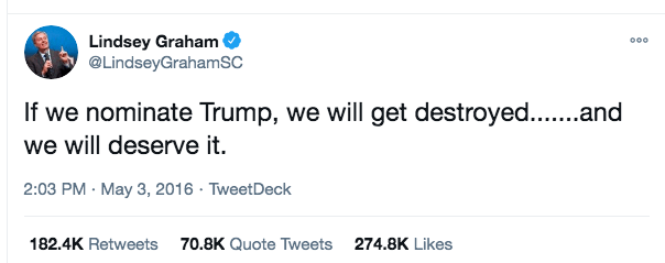 “My party has gone batshit crazy,” “a kook. I think he’s crazy. I think he’s unfit to be president.” Lindsey Graham to Fox News in May 2016.