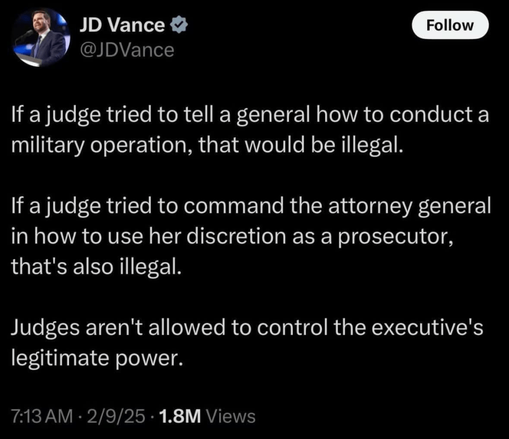 I think J.D. Vance might be getting the attention of our judiciary after some crazy comments he made yesterday on X (formerly known as Twitter.) While we were all watching Patrick Mahomes get clobbered after every snap, ol JD was spouting that judges don’t have any control over Trump’s executive power. On X he suggested that federal courts “aren’t allowed” to limit a president’s “legitimate power.”