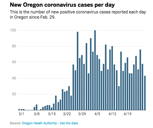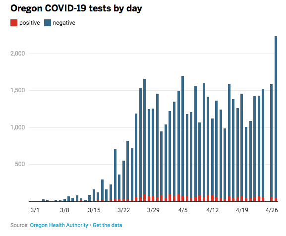 The data is showing that things are looking up in Oregon related to the number of reported new coronavirus cases and the number of tests performed. Yesterday, April 27th, saw a drop to 43 new cases reported for the day from 58 the day before and 76 new cases the day before that. The trend is definitely looking favorable. This, as well as the testing availability, is the data that the governor is looking at as she makes decisions on the easing of the current restrictions. The number of citizens tested in Oregon has shown an upward trend, which is also a positive sign. As of this morning there were 2,354 reported cases in Oregon with 92 deaths. Keep up the good work, comrades. Continue washing your hands frequently, stay home if you can, and if you do go out, use the social distance guidelines.